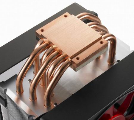 Сквозь медное основание идут шесть 6мм теплотрубок, пронизывающих алюминиевые рёбра (а их 55 и расположены они не симметрично) радиатора, а их в свою очередь, продувают два 120мм вентилятора DynaLoop, скорость вращения лопастей которых варьируется от 800 до 2200 оборотов в минуту (издаваемый шум - 15 децибел минимум, 38 - максимум, воздушный поток - 34.02 и 93.74 кубических фута в минуту), конечно же не обошлось и без LED подсветки. Новинка полностью совместима с Intel LGA 557/1156/1366 и AMD AM2/AM2+/AM3, вроде никого не обделили вниманием, разве что 775-й сокет.