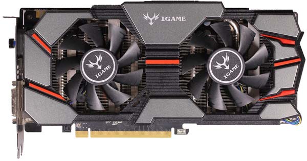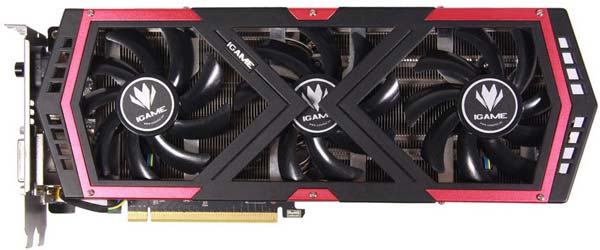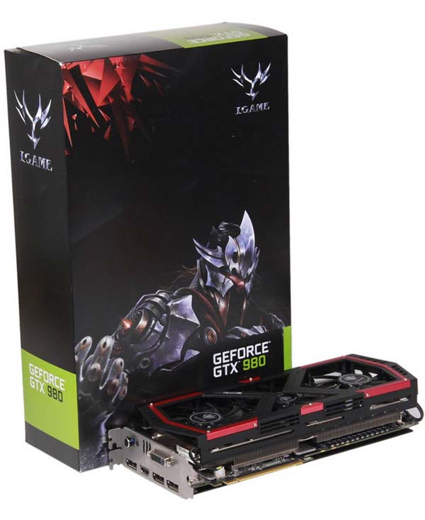 Устройство именуется iGame GTX 980, его называют перепичканным "фичами", мол трёхслотовое охлаждение такой карте как GTX 980 не нужно и покупатель будет зря переплачивать за кулер. Лично я так не думаю, ибо хороший кулер всегда к месту. Питание у карты реализуется по схеме 12+2, общий вид напоминает вариант GTX 780 Ti от этого же производителя.