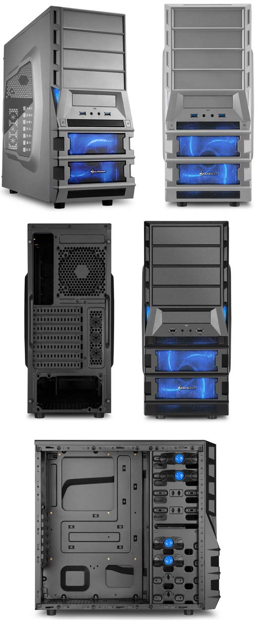 У новых творений Sharkoon по четыре 5.25" отсека, столько же мест для установки 3.5" накопителей и по одному месту для установки флоппи-дисковода (или картридера/иного внешнего устройства типоразмера 3.5") и 2.5" SSD/HDD. Корпуса рассчитаны на работу с системными платами форм-фактора ATX, имеют семь слотов расширения, материал изготовления не указан.