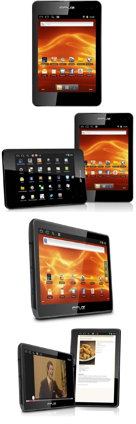 У Cruz T408 диагональ тачскрина равна 8 дюймам, а размер экрана T410 - 10 дюймов, разрешение первого - 800х600, а второго - 1024х600 пикселей. Характеристики устройств идентичны - 1ГГц одноядерный процессор Cortex-A8, 512МБ оперативной памяти и 4ГБ места на встроенном накопителе. Камера одна - фронтальная, разрешение не указано (это почти всегда означает VGA разрешение), имеется слот для карт microSD/SDHC, акселерометр и поддержка 802.11 b/g/n WiFi. Работают девайсы под чутким надзором Android 2.3.