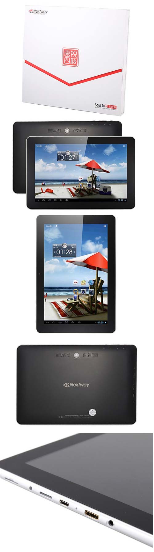 Планшетник называется Nextway F10X, у него 10.1" IPS экран с разрешение 1280x800. Дисплей сенсорный, с поддержкой 10-и точечного Multi-Touch. За вычисления отвечает Allwinner A31 (ARM Cortex-A7), частота - 1.6ГГц, за видео - VR SGX544 MP2.