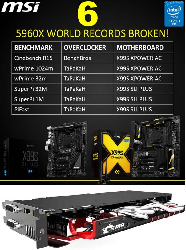 Нам сообщают, что новенькая материнская плата MSI X99S XPOWER AC уже успела стать платформой для установления мирового рекорда в дисциплине Cinebench R15. На ней трудился разогнанный до 5931.02МГц процессор Core i7-5960X, это на ~200МГц выше, чем позволяют разгонять другие системные платы, если верить MSI. А с помощью X99S SLI PLUS удалось поставить ещё три рекорда в других дисциплинах - SuperPi 32M и 1M и PiFast. А X99S XPOWER AC отличилась ещё и в wPrime 1024M и 32M.