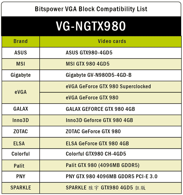 Нам также предоставили список совместимости видеокарт с водоблоком: