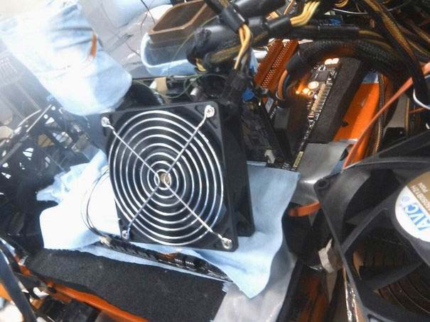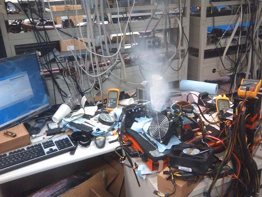 Самой-собой такой рекорд не мог пройти на штатной системе охлаждения - использовался жидкий азот. К карте были применены вольтмоды, соответствующие фотки будут ниже. Видяшка была довольно стабильна и на частоте 1519МГц по ядру проходила один цикл 3DMark03.