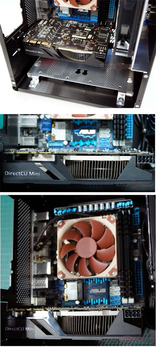 Кулер изделия DirectCU Mini состоит из двух частей - металлической пластины, которая охлаждает память и VRM, а также из радиатора с ~80мм вентилятором, который понижает температуру графического ядра.