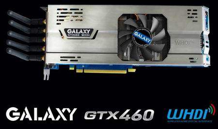 Вас бесит куча проводов сзади системного блока? Меня - очень, а тут как раз хорошая новость от компании Galaxy на эту тему. Тайваньский гигант показывает вариант популярной GTX460, использующий технологию WHDI от AMIMON, позволяющую передавать сигнал с видяхи на устройство вывода изображения без проводов.