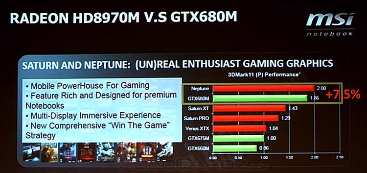 Как видно, преимущество "новинки" над GTX 680M имеется, но 6.7% не назвать большой цифрой. Ждём официального представления Radeon HD 8970M и ноутбуков, которые будут этим решением оснащены.