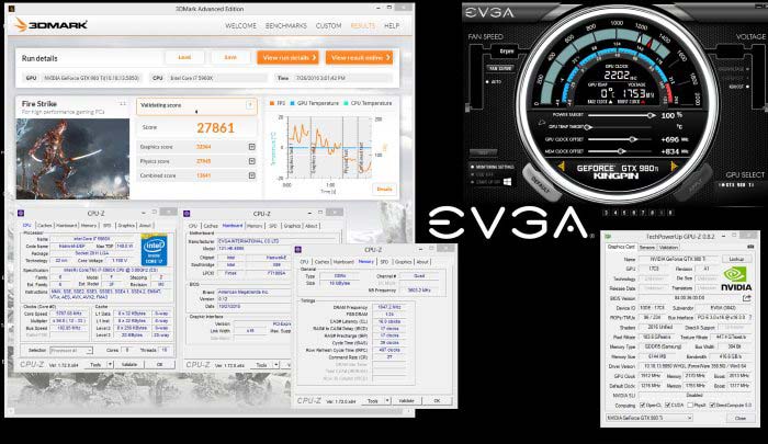 Знаменитому энтузиасту удалось разогнать и без того быструю видеокарту GeForce GTX 980 Ti K|NGP|N Edition до 2200МГц по ядру, разумеется для охлаждения использовался жидкий азот. Помимо дорогущего графического адаптера в составе тестового стенда трудилась материнская плата EVGA X99 Micro2 и блок питания SuperNOVA от того же производителя, более никакими данными с нами поделиться никто не поспешил.