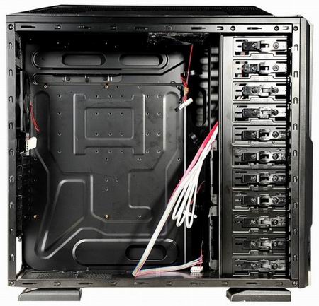 Габариты крепыша - 595х215х580мм, вес - 13 с половиной килограмм. Как хорошо видно по фотографиям, вся передняя часть шасси перфорирована (на мой взгляд, такой дизайн довольно удачен). При внешнем осмотре новинки, сразу бросаются в глаза пять отсеков для 5.25" устройств, четыре порта USB 2.0, один eSATA и порты для микрофона и колонок/наушников, а если заглянуть внутрь можно увидеть, что предусмотрено восемь мест для установки 3.5" винчестеров.