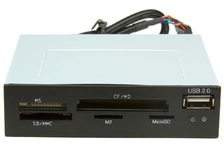 Устройство носит название Kama Reader Jr. ("Кама ридер младший") и предназначено для встраивания его в 3.5" отсек ПК. Габариты девайса: 101х25.5х9мм, вес не указан. Новинка способна читать карты памяти многих форматов: Memory Stick (PRO, ROM), Memory Stick (DUO, PRO-ROM), Compact Flash, Micro Drive, SD Card, SDHC Card, Mini SD (нужен спец.адаптер), Mini SDHC (нужен спец.адаптер), MultiMedia Card (MMC), RS-MMC (нужен спец.адаптер), MMC Micro (нужен спец.адаптер), Memory Stick Micro, Micro SD, Micro SDHC. Что там за адаптер такой нужен - не указывается.
