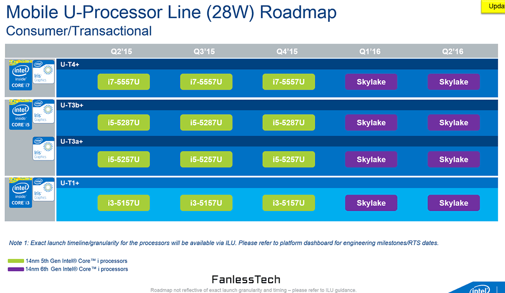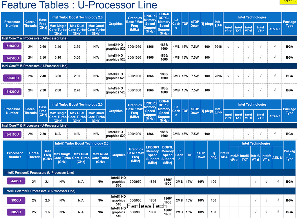 Мои коллеги с ресурс FanlessTech опубликовали слайды, на которых запечатлены спецификации новых энергоэффективных процессоров Skylake-U от Intel.