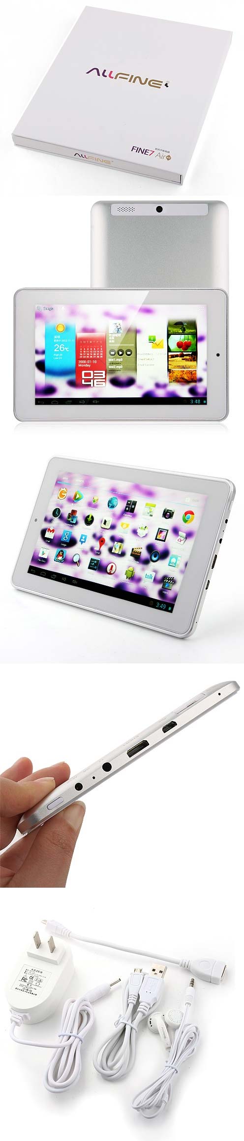 Новинка имеет размеры 194x122x9.7мм и весит 300 граммов, аппарат поддерживает 802.11 b/g/n WiFi, но не Bluetooth. От встроенной батареи на 4300 мАч изделие работает до 5 часов. У ALLFINE FINE7 две камеры - 2МП задняя и 0.3МП фронтальная, также у планшета есть слот для карточек microSD, выход на наушники и порт Micro USB.
