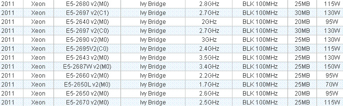 Благодаря обновлению списка поддерживаемых процессоров системными платами ASRock, стали известны спецификации серверных процессоров Xeon E5 на базе Ivy Bridge-EP, использующих сокет LGA2011. Как можно увидеть в списке ниже, указаны тактовая частота, размер кеша, TDP, номер партии, BLK процессоров. Все изделия можно разделить на три категории: обладающие 8-ю, 10-ю и 12-и ядрами. Минимальный показатель TDP равен 70 ваттам, когда как максимальный - 150 ваттам.