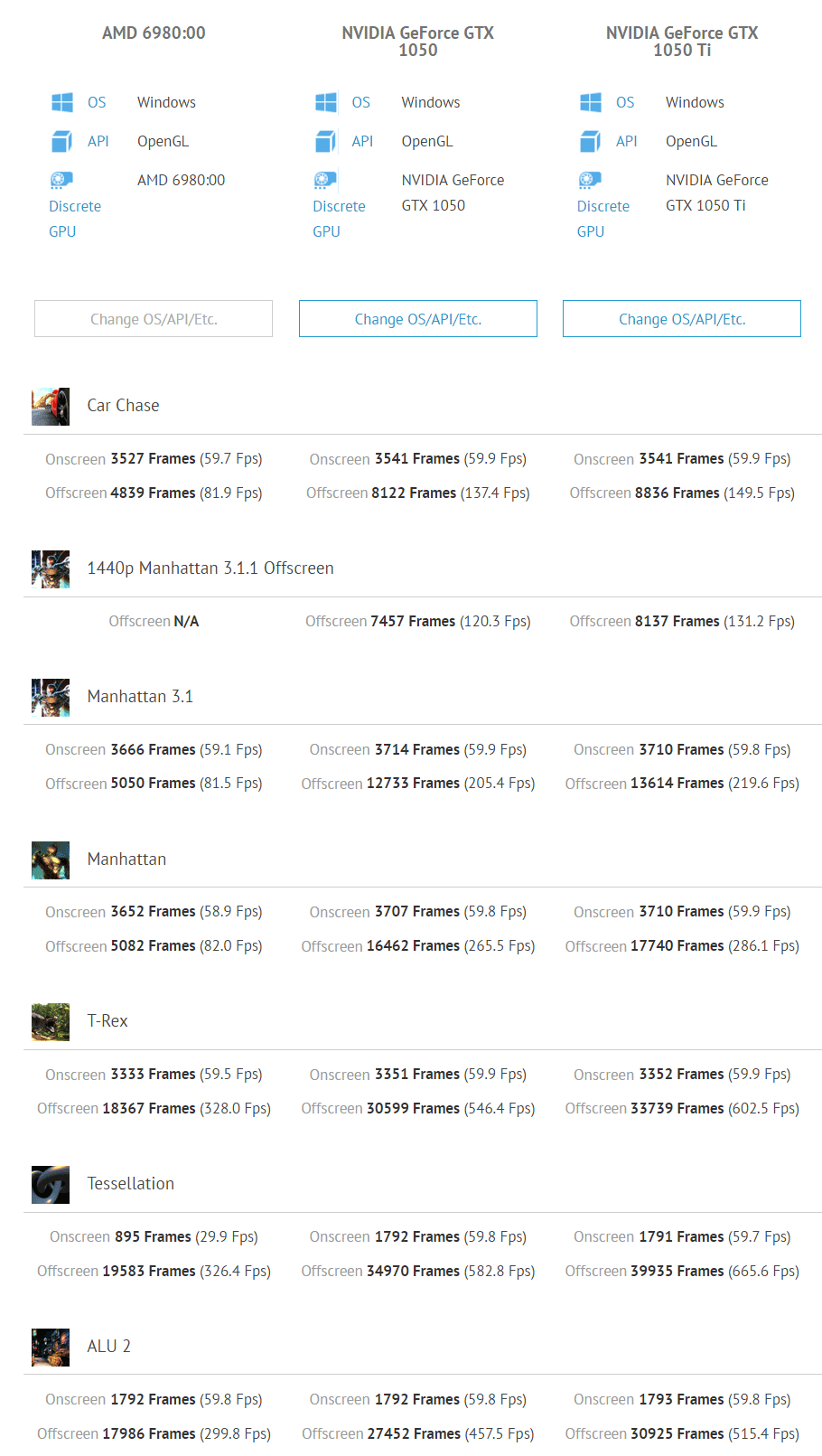 Успели погонять новую карточку и в GFXBench, да сравнить с видеокартами серии GeForce GTX 1050/Ti: