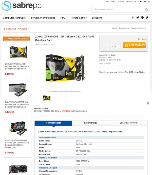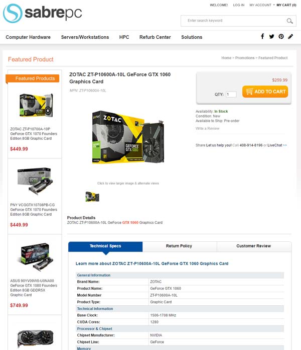 Далее нам показывают скриншоты страниц некоего онлайн-магазина, в котором продаются два уже знакомых нам варианта GTX 1060 от Zotac: