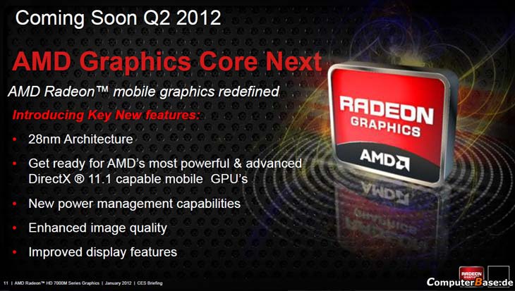 На CES 2012 стал доступен слайд, в котором сказано, что уже во втором квартале этого года начнутся поставки мобильных видеокарт семейства Radeon HD 7000M, созданных по нормам 28нм тех.процесса. Эти решения будут поддерживать те же самые "фичи", что и варианты видях HD 7000 для настольного сегмента рынка, так что производительность должна быть на высоте.