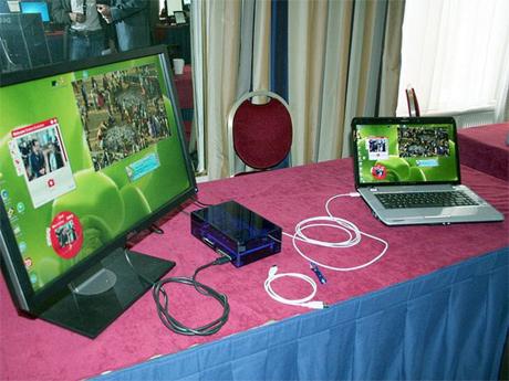 На фото показано как, используя новый интерфейс, ноутбук передаёт на внешний монитор сразу два сигнала высокой чёткости.
