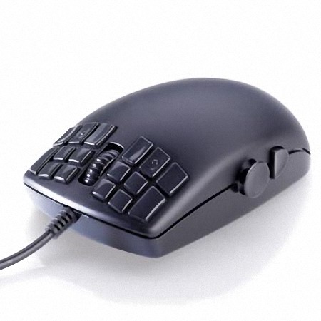 Я помню как с трудом управлялся с 5-и кнопочной мышью, сейчас использую стандартную 3-х кнопочную (две кнопки + кликабельное колёсико), а тут кому-то понадобилось аж 18 кнопок. Данные по этому мышиному ужасу: 18 кнопок, 48 программируемых команд, 64 режима (не ясно режимов чего) и 512 килобайт собственной памяти. На кнопки мыши можно вешать любые сочетания клавиш клавиатуры и макросы. Есть даже аналоговый джойстик (видимо тот, что сбоку, на фото ниже), позволяющий вращать предметы по их оси в 3Д-редакторах типа Maya и 3Dmax. Мышь совместима с WIndows, MacOS и Linux.