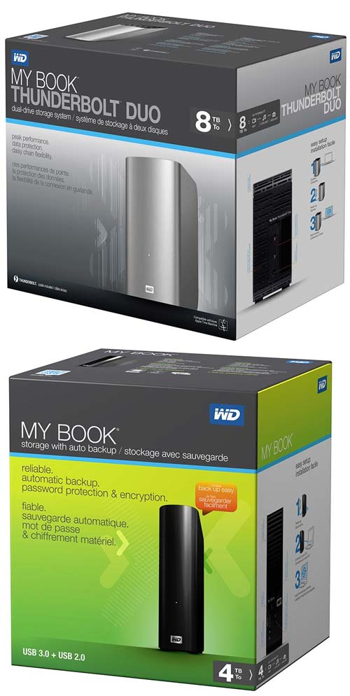 Винчестеры внешние, но не особенно портативные - 4ТБ My Book весит 1180 граммов, а 8ТБ My Book Duo аж 2260 граммов. Стоит отметить, что в My Book Duo накопители трудятся в RAID 0 (или же в RAID 1 или JBOD, в зависимости от настроек), а подключение устройства Western Digital осуществляется по Thunderbolt (таких портов имеется две штуки). При этом My Book подключается по USB 3.0, но оба девайса имеют внешнее питание.
