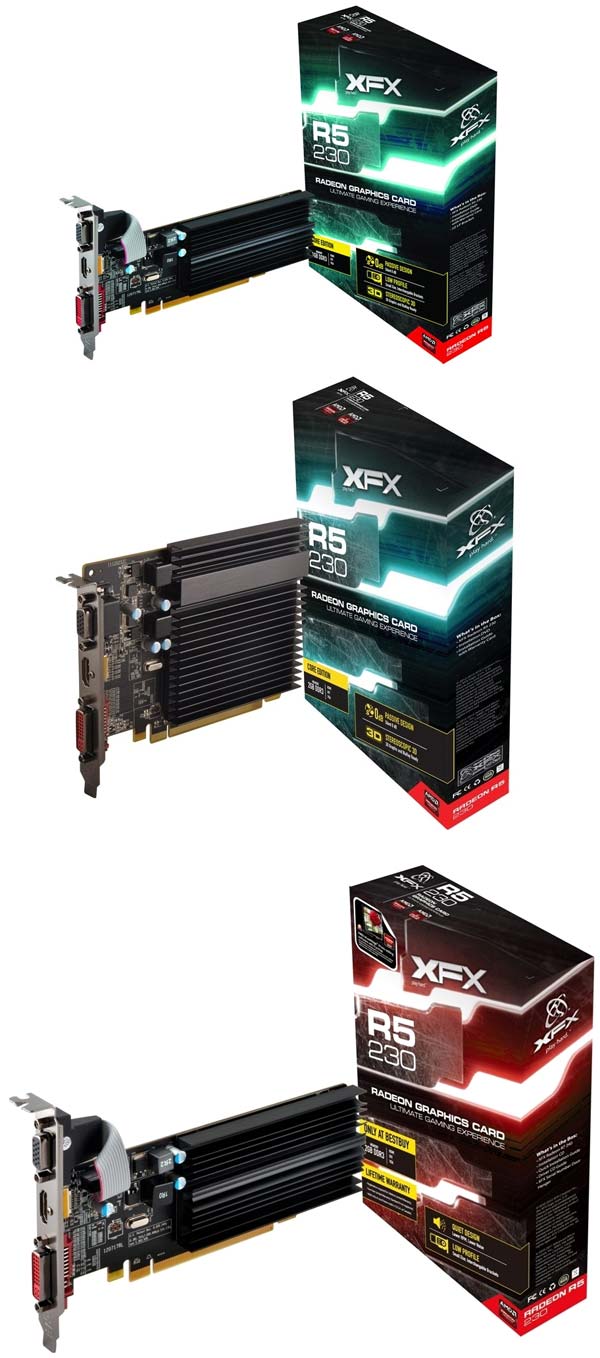 XFX поставила перед собой цель переплюнуть Club 3D и представить не три видеокарты новой серии, а целых пять. Четыре новинки являются низкопрофильными устройствами, а пятая использует полноформатную печатную плату, т.е. высокую. Новинки разумно оснащены пассивными системами охлаждения, имеют тактовую частоту ядра 625МГц.