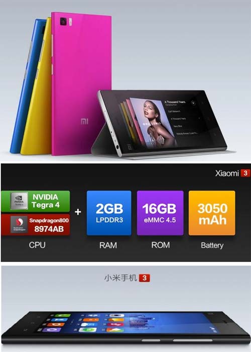 Аппарат достойный, как ни крути - Mi3 может похвастаться 5" Multi-touch IPS экраном от LG, имеющим Full HD разрешение. Помимо этого изделие обладает мощной четырёхъядерной SoC Qualcomm Snapdragon 800 или же Nvidia Tegra 4, первая SoC предназначена для клиентов China Unicom, а вторая для прочих.