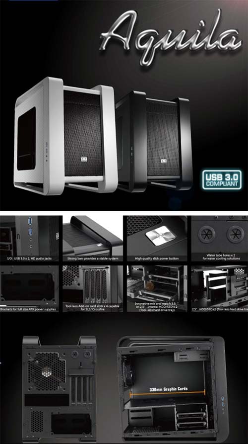 Шасси называется Aquila, оно рассчитано на работу с материнскими платами форм-фактора MicroATX, дизайн новинки необычен, но привлекателен. В корпусе имеется место для процессорного кулера высотой до 180мм, а также 330мм (указана длина) видеокарты, а значит собрать геймерский ПК не будет проблемой.