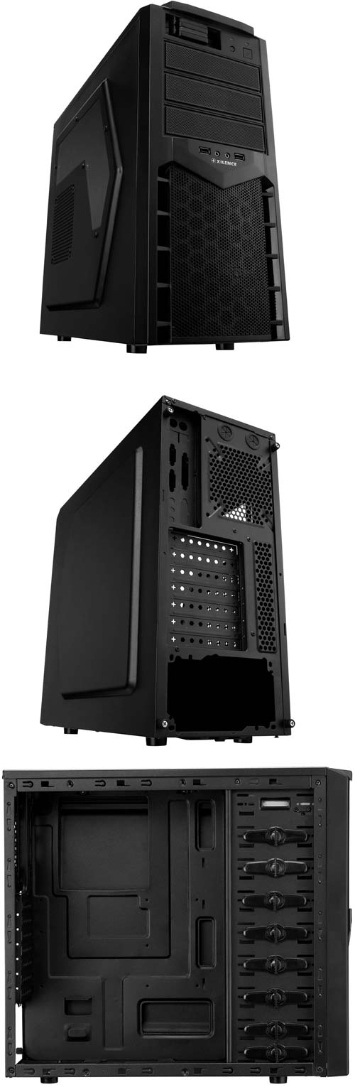 Для охлаждения внутреннего пространства шасси внутрь можно установить до четырёх 120мм вентиляторов, один из которых уже имеется внутри корпуса, он расположен в фронтальной части продукта Xilence, прямо за перфорацией. В задней части корпуса есть отверстия для шлангов СВО, также есть место для укладки кабелей за лотком материнской платы. Кулеры с бэкплейтом могут устанавливаться в GEH-XP-MON без демонтажа материнской платы. В передней части шасси есть панель ввода/вывода с аудио входами/выходами и парой USB 2.0, последний факт несколько разочаровывает, в новом корпусе неплохо бы сделать USB 3.0 порты. Количество слотов расширения равно семи штукам.