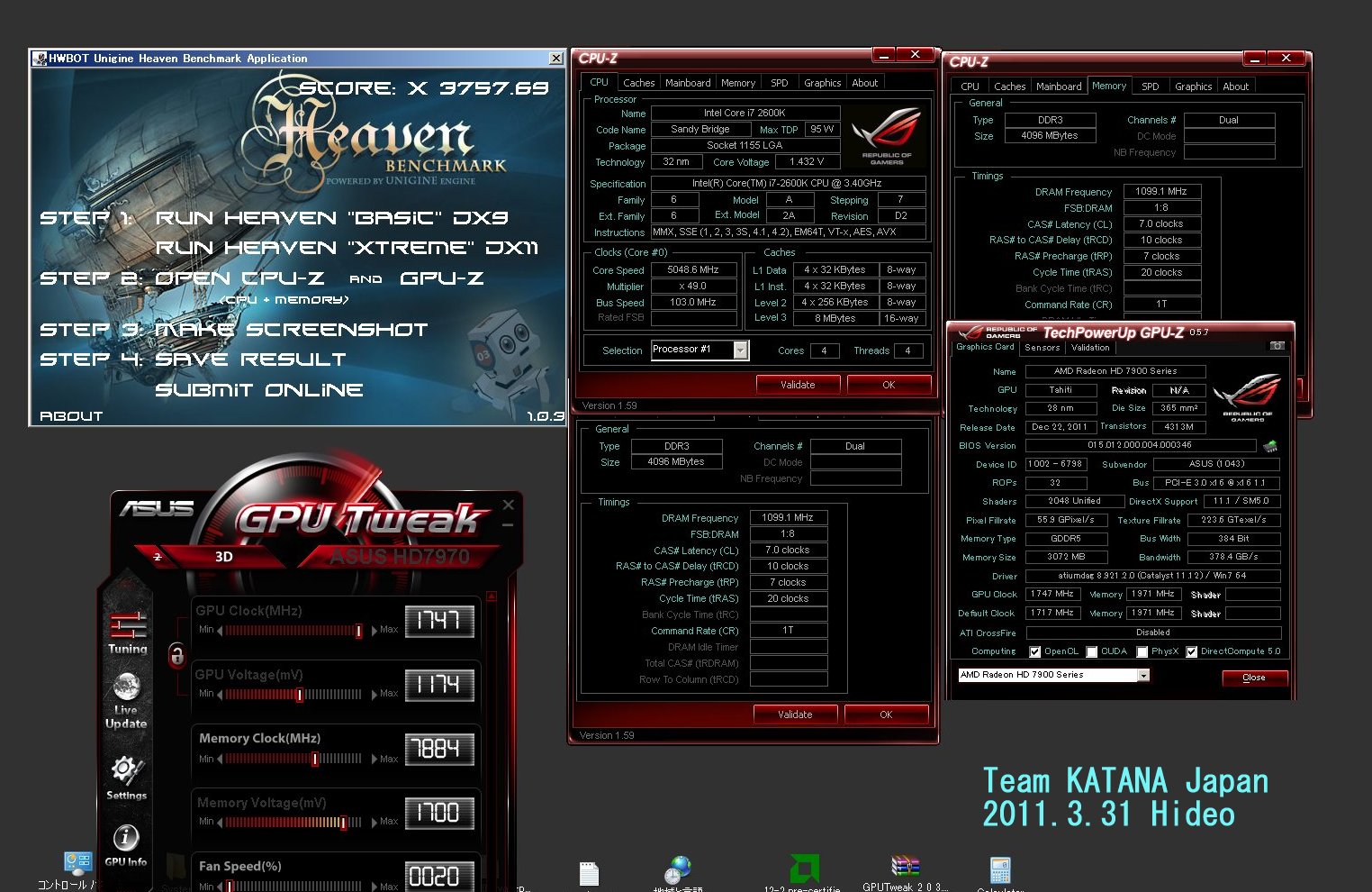 Таким образом японская команда набрала X3757.69 очков в Unigine Heaven, получив первое место в рейтинге HWBOT "GLOBAL 1X GPU RANK", а также "Radeon HD 7970 rank". Тестовый стенд, помимо столь разогнанной HD 7970, включал в себя процессор Intel Core i7-2600K, работавший на ~5048ГГц, материнскую плату ASUS Maximus IV Extreme (P67) да 1200 ваттный блок питания.