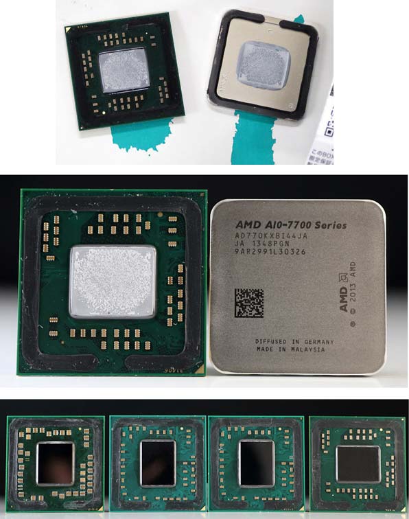 Японцы удалили крышку распределения тепла (её ещё называют IHS - интегрированный теплораспределитель) с A10-7700K, процесс назван относительно простым делом в умелых руках, вероятность скола кристалла невелика. В новом APU используются два ядра Steamroller, 4МБ кеша второго уровня и весьма крутое графическое решение, базирующееся на микроархитектуре GCN и имеющее 512 потоковых процессоров. Впрочем, хватит терминов и тех.данных, давайте поглядим на APU в голом виде: