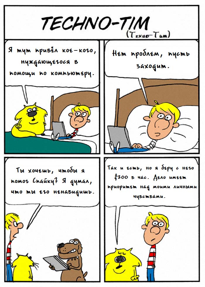 Уже на протяжении некоторого времени я просматриваю забавные одностраничные комиксы с сайта ТекКоннект, они на железячную тематику и довольно юморные. Я буду их публиковать по мере выхода там, на сайте. Конечно же на русском языке, чтобы смысл был понятен всем посетителям.