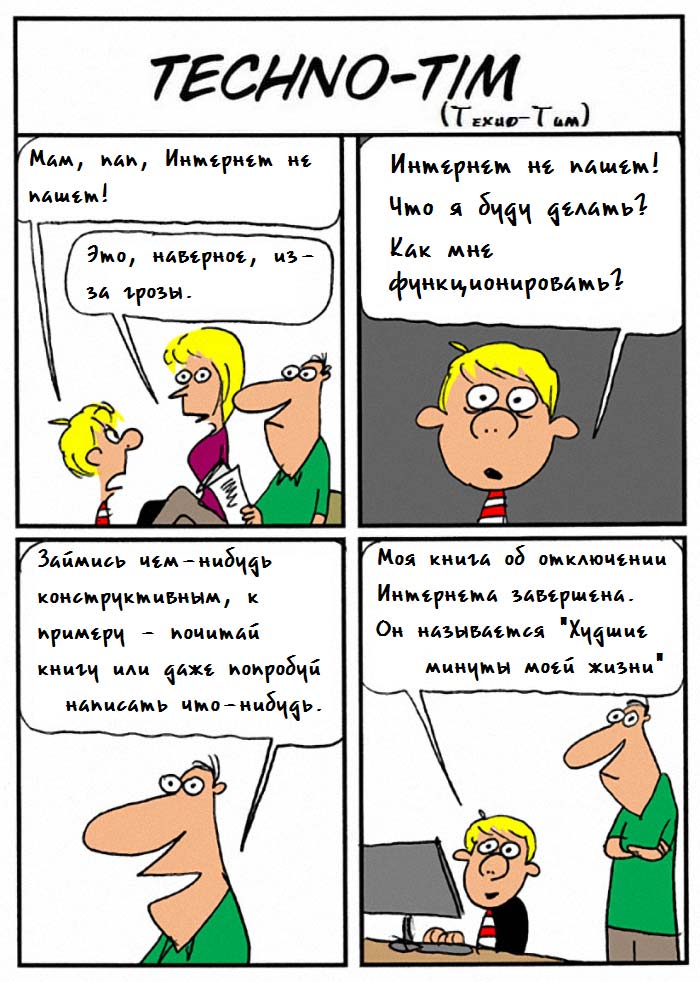 Уже на протяжении некоторого времени я просматриваю забавные одностраничные комиксы с сайта ТекКоннект, они на железячную тематику и довольно юморные. Я буду их публиковать по мере выхода там, на сайте. Конечно же на русском языке, чтобы смысл был понятен всем посетителям.