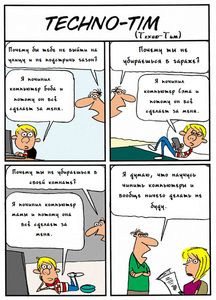 Уже на протяжении некоторого времени я просматриваю забавные одностраничные комиксы с сайта ТекКоннект, они на железячную тематику и довольно юморные. Я буду их публиковать по мере выхода там, на сайте. Конечно же на русском языке, чтобы смысл был понятен всем посетителям.