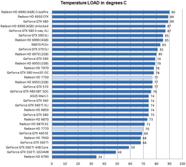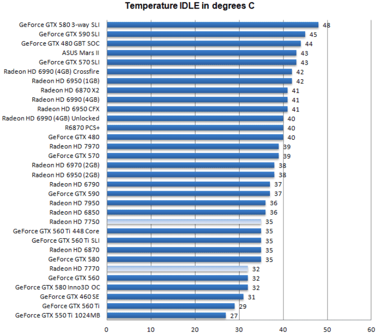 Давайте поглядим на то, как греются различные видеокарты, в том числе и рассматриваемые AMD Radeon HD 7750 и HD 7770, в простое: