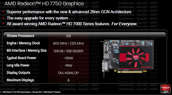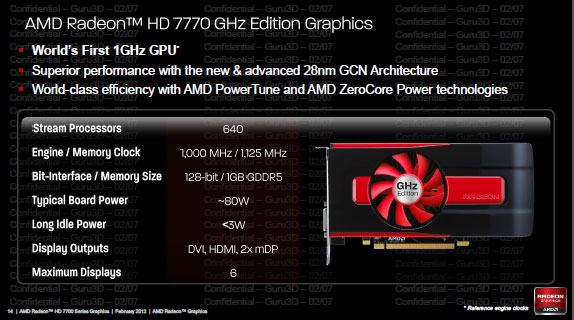 Полюбуемся на официальный слайд от AMD, исписанный самым уродливым образом логотипами Guru3D, в котором можно сравнить спецификации изделий семейства HD 7700: