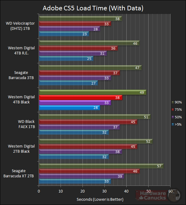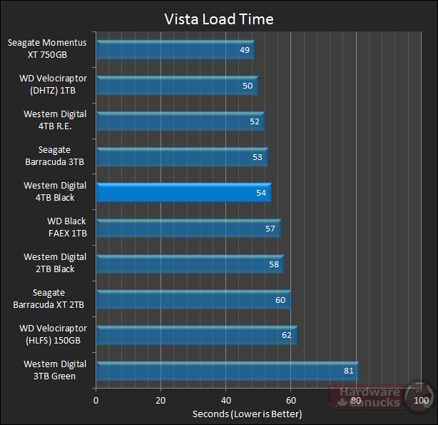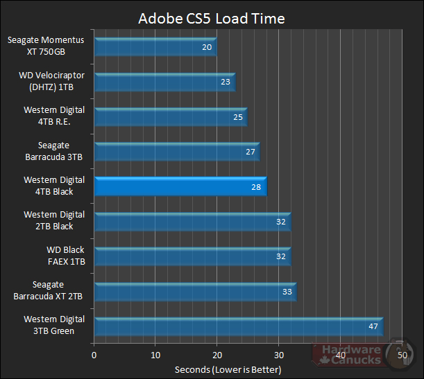 Тут разница уже 3 секунды, а учитывая общее время загрузки приложения, это более весомо. Тем не менее, результат WD Black 4ТБ называется хорошим.