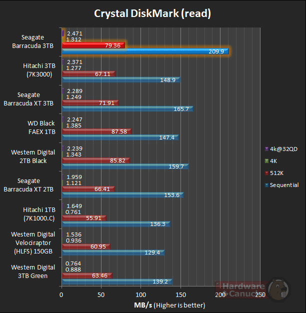 Результаты у всех винчестеров назвать иначе, как удручающими нельзя, но это и неудивительно - всё же тест разрабатывался для SATA 6Гб/с твердотельных накопителей. Видно, что RE несколько быстрее героя материала. Лучший результат показал гибридный накопитель от Seagate.