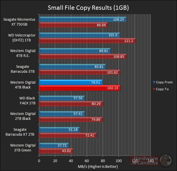 Скорость последовательной записи и чтения достаточно высокие, а вот работа с мелкими файлами не впечатляет. Конечно, это шаг вперёд по сравнению с WD Black прошлого поколения, но до результатов WD RE этому 4ТБ винчестеру далеко.