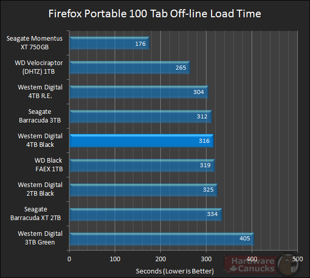 Довольно необычный тест, но также весьма показательный. Открывается 100 вкладок в браузере, Firefox настраивается так, что все вкладки открывались при старте, плюс ему выставляется offline режим. Всё это добро грузится с винчестера, всегда из одного и того же места (недаром используется портативный ФФ), потому тест можно повторить сколько угодно раз.