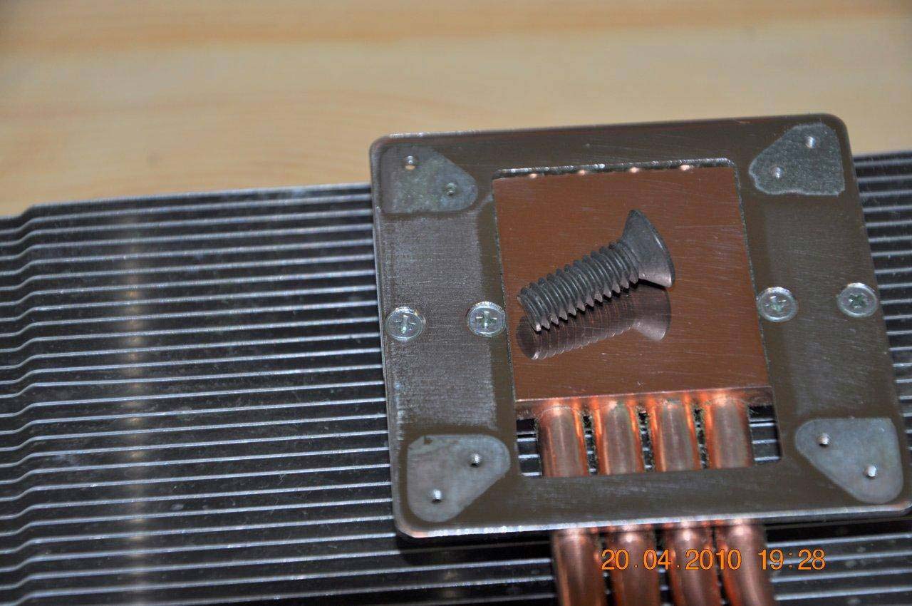 Ну вот все готово, снимаю со второй карты родную СО. Ставлю Таракана, радиаторы на память (оставшиеся от Арктика), на отдельно стоящий силовик памяти ставлю заранее подготовленный оставшийся самодельный медный радиатор, фиксирую его 2 винтами М3 в отверстия с резьбой, заранее подготовленные в этом радиаторе. Затем приходит черёд VRM-4. Проверив его перед окончательной установкой я его немного разогнул его, чтобы он не уперся в стоящий сверху VRM-3. Вместо отправленной изначально в мусорник родной термопрокладки ставлю аккуратно снятую лезвием т-прокладку с рамы родной СО (чтобы не елозила) и добавляю под нее и на нее по капле термопасты OCZ Freeze Extreme, её же наношу на видеочип перед установкой Таракана.