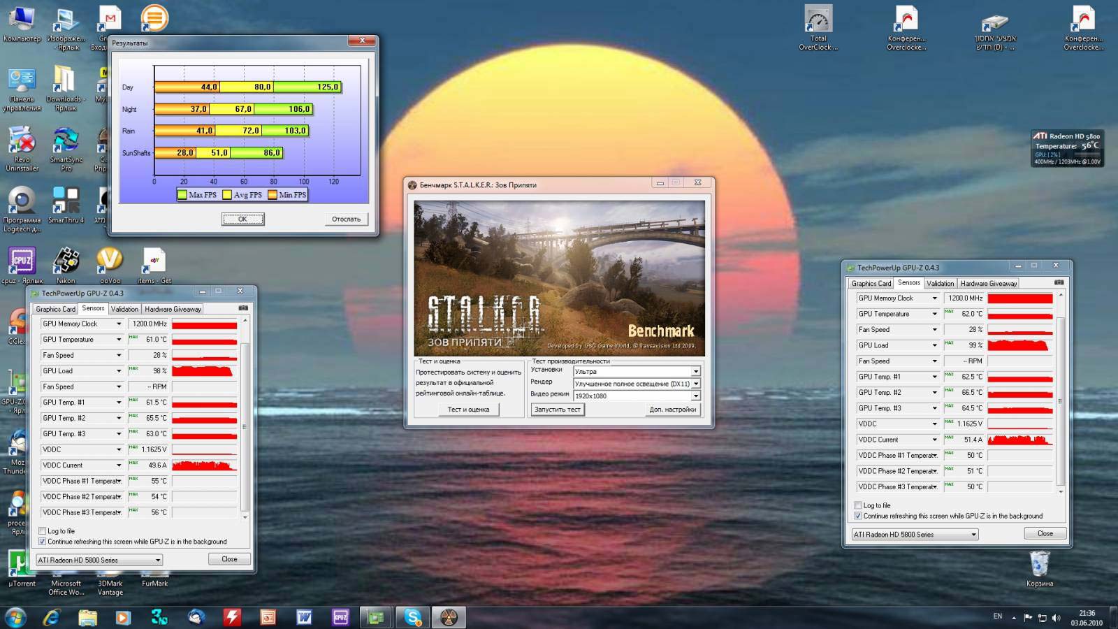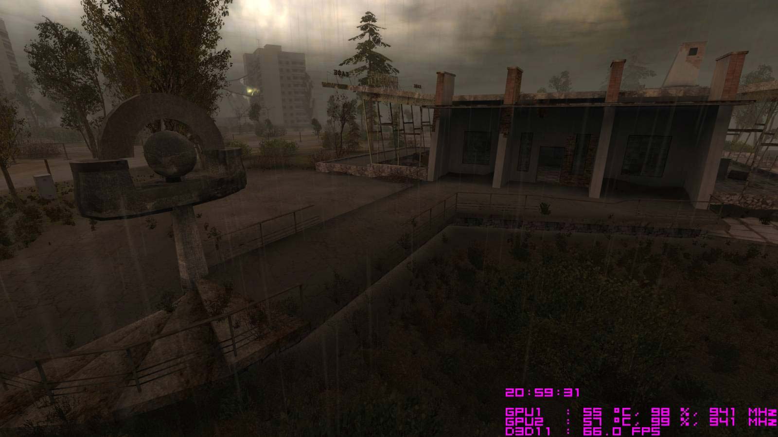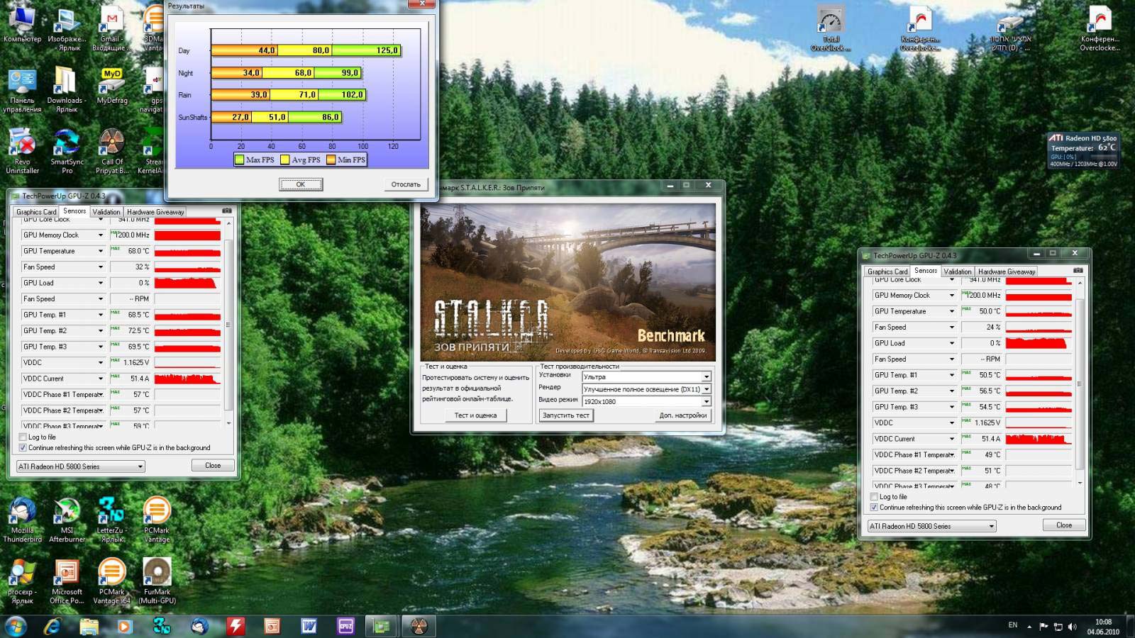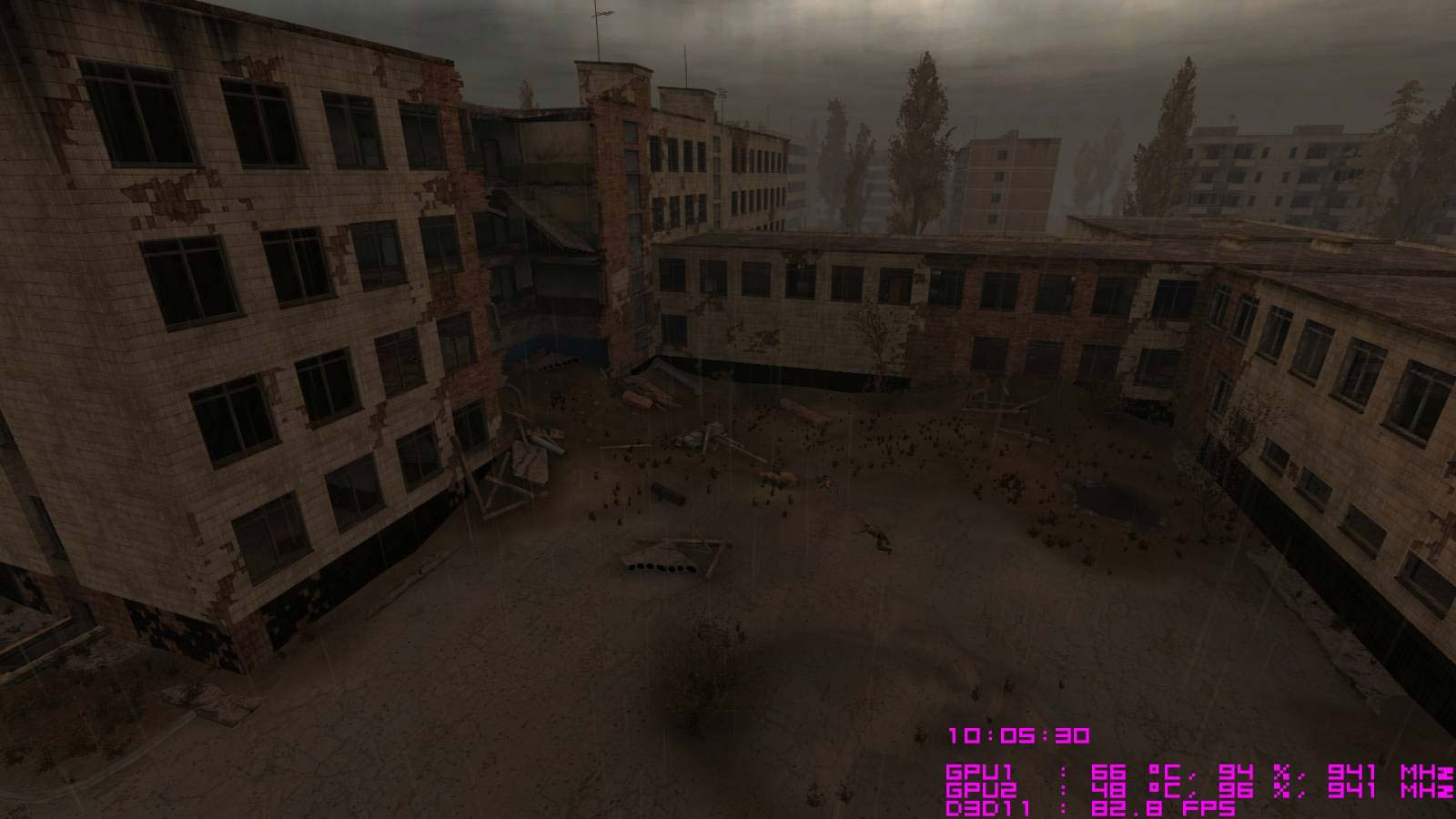 Решил проверять бенчмарком Stalker: Зов Припяти. Тест в принципе для других целей, но я провел эксперимент, прогнав несколько общеупотребимых "бенчей" чтобы выяснить какой из них прогревает карту сильнее других. Т.е. условия наиболее приближенные к реальной тяжелой графической игровой нагрузке. Именно Сталкер греет сильнее и продолжительней всего - как-никак бенчмарк включает в себя 4 сцены.