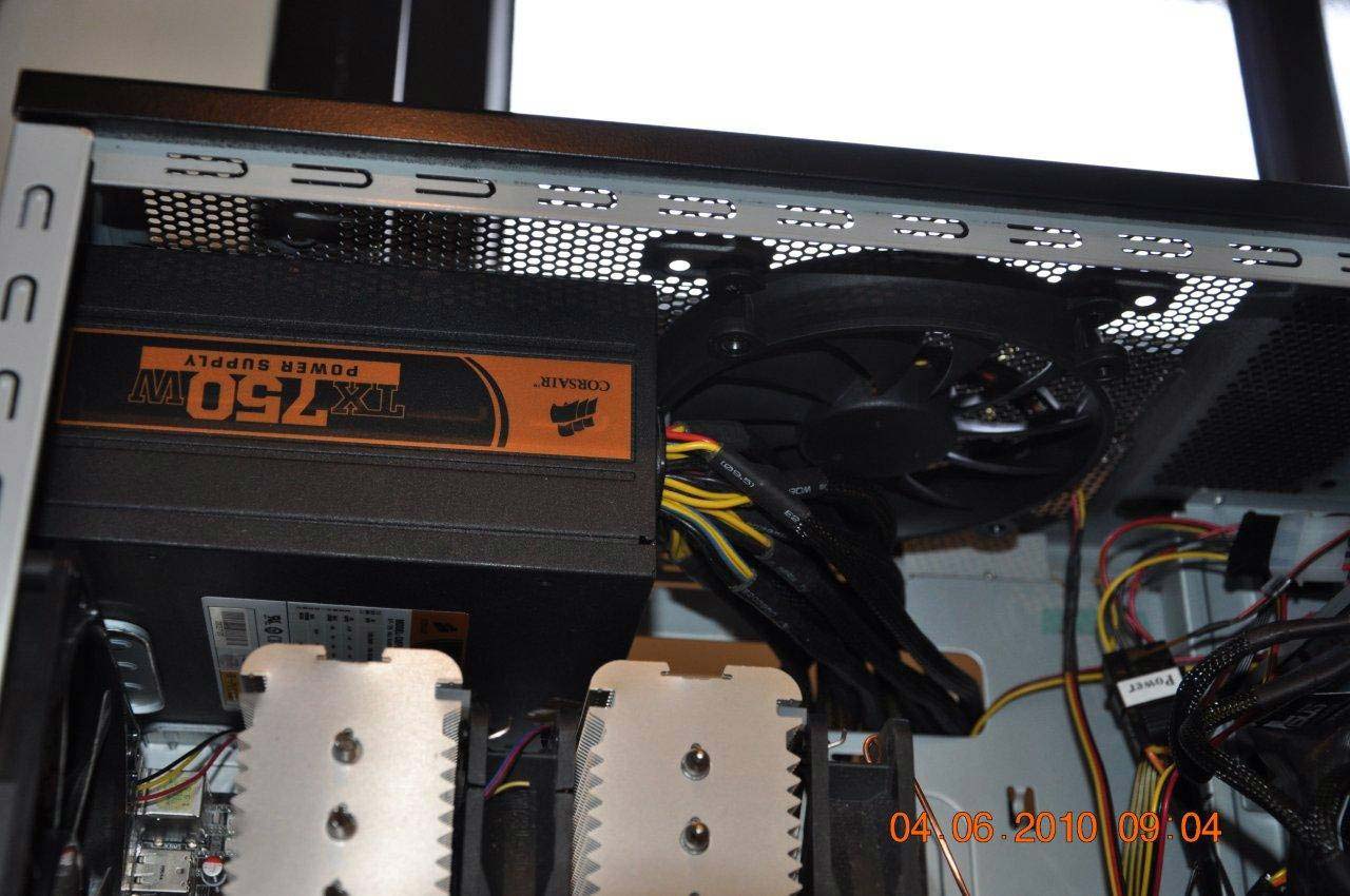 Проснувшись утром, на свежую голову, хоть и зная заранее какой это геморрой, я вынимаю БП (у него длинные и не съемные кабеля) и переставляю его наверх перевернув на 180 градусов. Помните я говорил об удобстве и преимуществе этого корпуса? Так вот - это одно из них, возможность выбрать место установки БП, кроме того - прекрасная система охлаждения, вентиляторы которое я запитал через реобас.