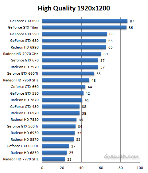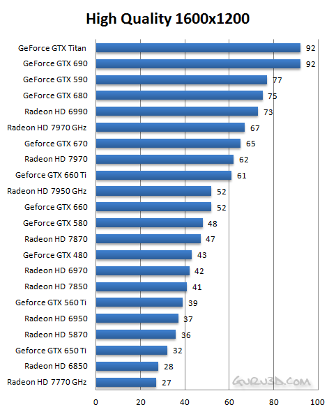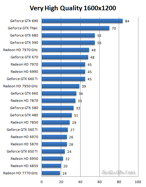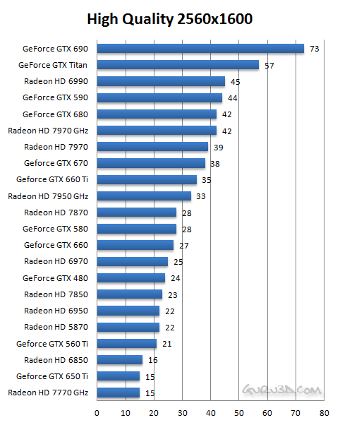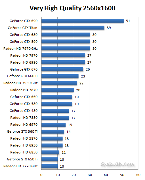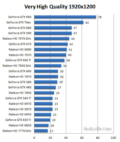 Тут уже и мощи GTX Titan не хватает на стабильные 60FPS, GTX 690 - абсолютный лидер по данному тесту. GTX 680 и HD 7970 Ghz Edition подойдут в качестве минимума.
