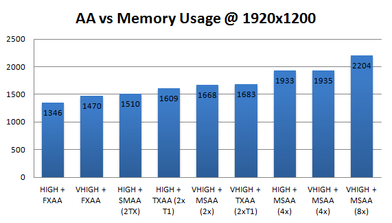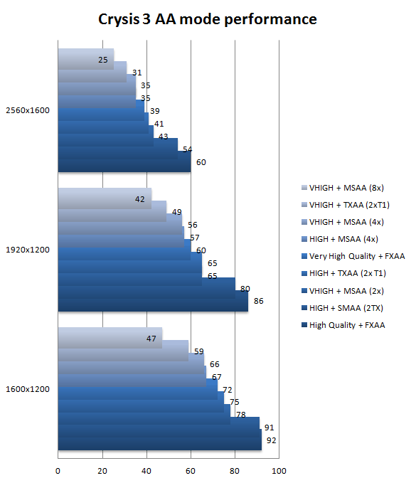 На графике выше показано, как теряется производительность с ростом антиалиасинга. Тесты проводятся на пресете Very High. С FXAA ситуация неплохая, этот режим даёт возможность гонять Crysis 3 в Full HD на многих видеокартах, совсем другое дело - MSAA, этот метод антиалиасинга намного более требователен к "железу", зато лишён свойственной FXAA мутности/заblurенности картинки.