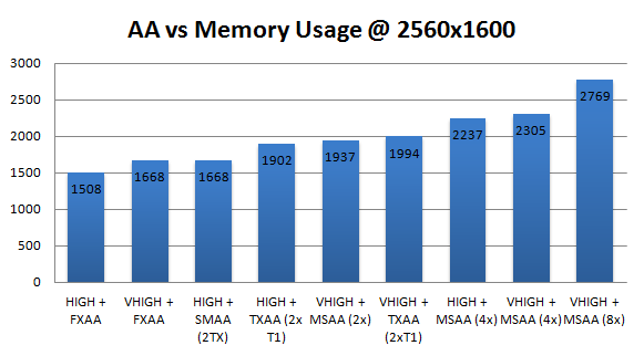 В этом разрешении дела для видеокарт с 2ГБ памяти не так радостны, как в 1920x1200, даже при настройках High + 4XMSAA "Крайсис 3" потребляет 2237МБ, на максимальных настройках эта цифра и вовсе доходит до 2769МБ. Ревьювер не зря рекомендует использовать метод сглаживания FXAA, который не столь жаден до памяти. Как бы там ни было, 2ГБ тут минимум.