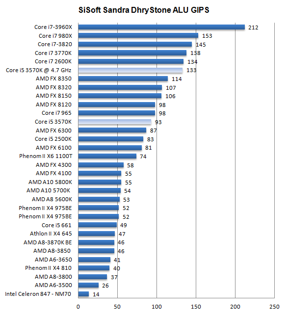 Посмотрим на тест производительности DhryStone из набора SiSoft Sandra, вернее результаты из него: