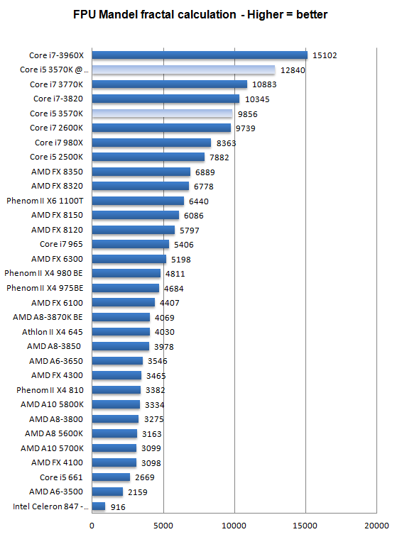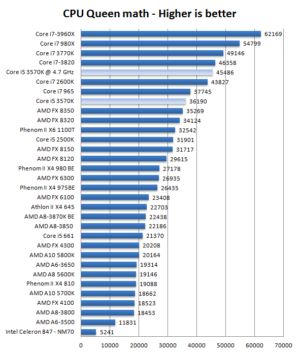Теперь наблюдаем, как разогнанный Core i5-3570K справляется с тестом CPU Queen по сравнению с самим собой, функционирующим в стоковом режиме: