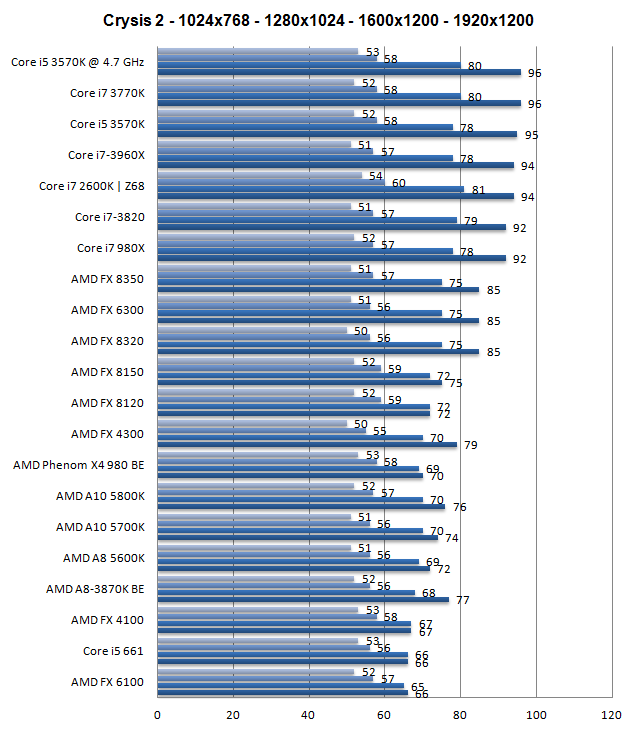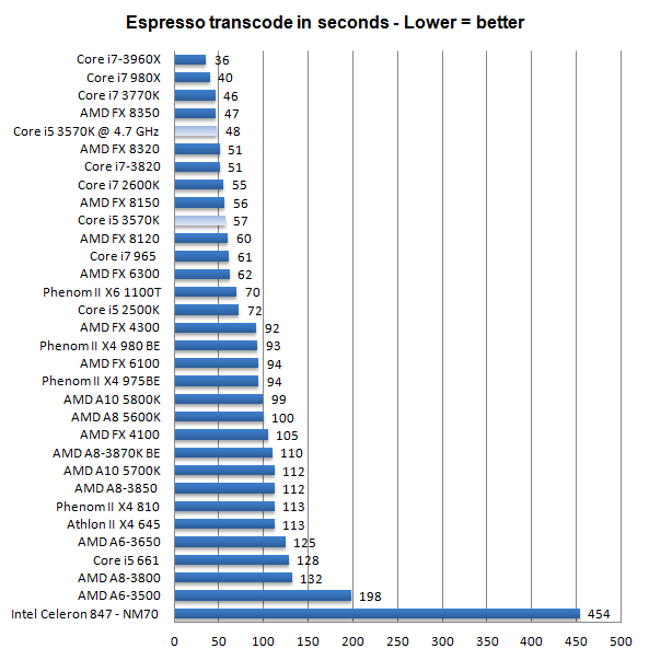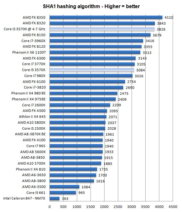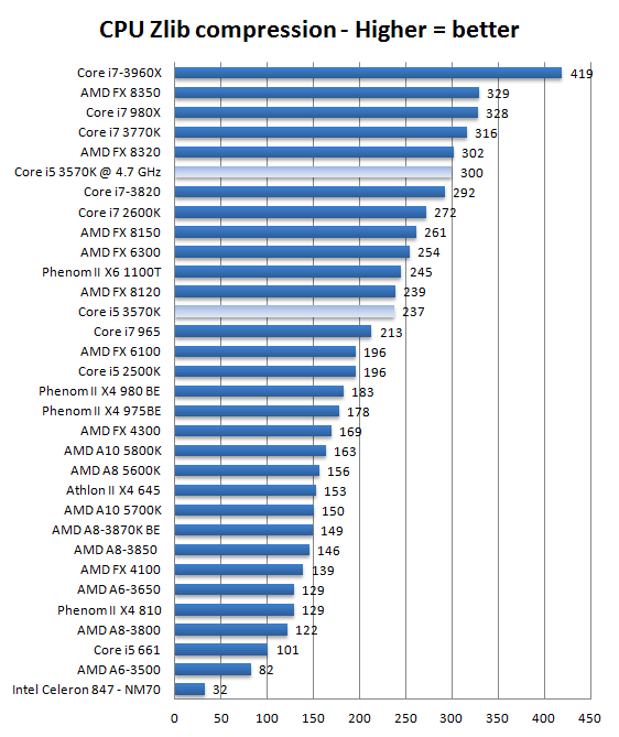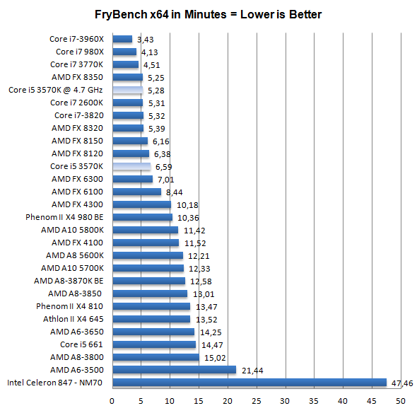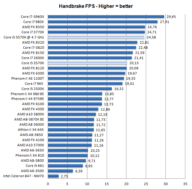 Разогнанный до 4.7ГГц Core i5-3570K - единственный процессор Intel, что смог войти в ТОП 3 данного теста.