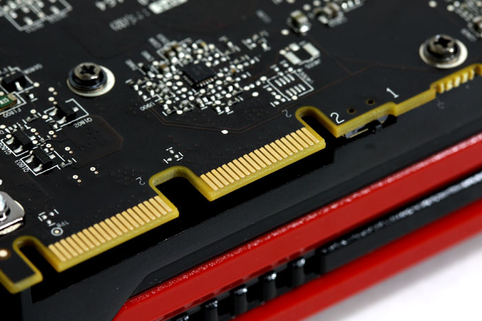 Коннекторы для построения CrossFireX тандема, таким образом можно объединить до четырёх HD 7970. Справа от CFX коннекторов виден переключатель BIOS - в положении "1" пользователь волен выставлять какие угодно частоты и напряжения на ядре (соответствующим софтом), а если переключиться на "2", то поменять ничего не удастся - там "зашиты" не меняемые заводские параметры.