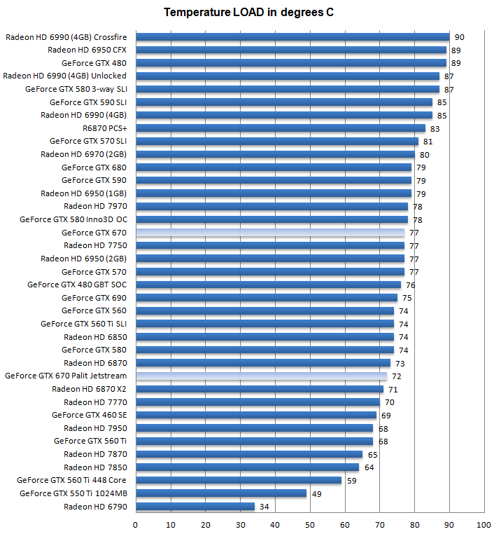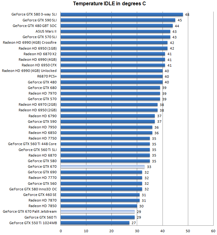 Поглядим на рабочие температуры Palit GeForce GTX 670 JetStream, как в простое, так и в нагрузке: