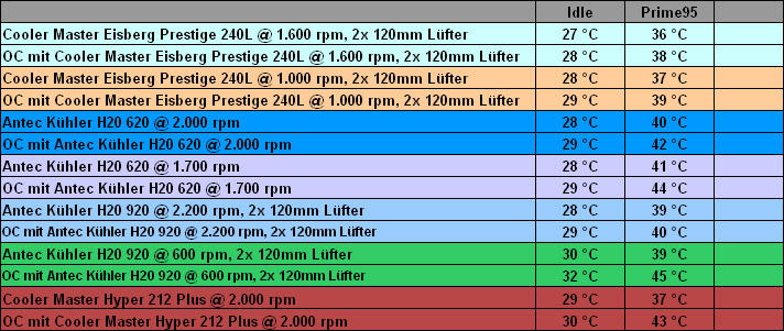 Совершенно непонятно, на каком ПК тестировали данную СВО, даже процессор не указан (хотя судя по фото, это APU A8-5600K от AMD). Либо я плохо смотрел и не нашёл конфигурацию тестового стенда, либо её в самом деле нет в материале. Как бы там ни было, тест проводился и в простое, и в нагрузке Prime 95, как на разогнанном, так и не на разогнанном CPU/APU, а показания снимались при помощи SpeedFan 4.40. Температура в помещении была в районе 23-24 градусов по Цельсию. ПК работал без корпуса, т.е. тестировалось всё на открытом стенде.